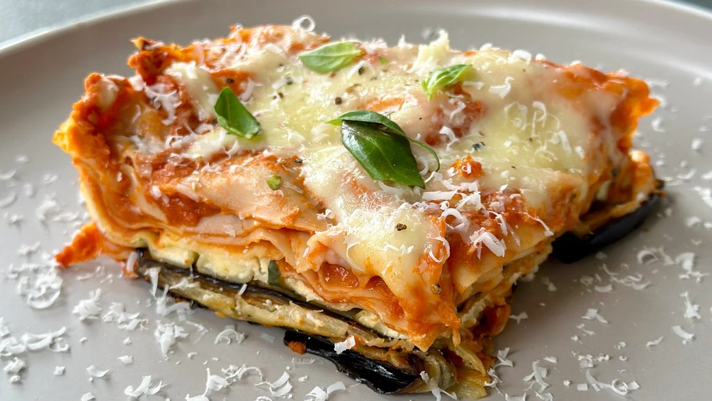 Lasagne de boeuf à l’aubergine et courgettes grillées